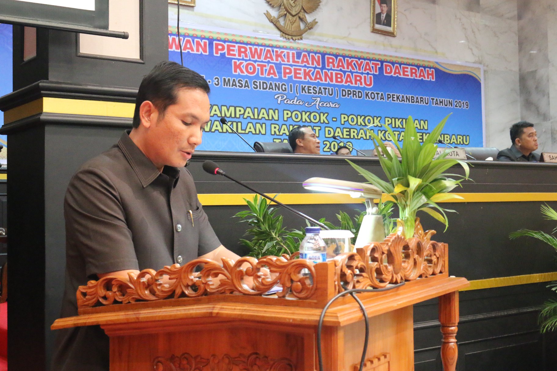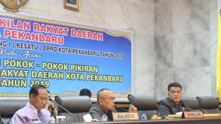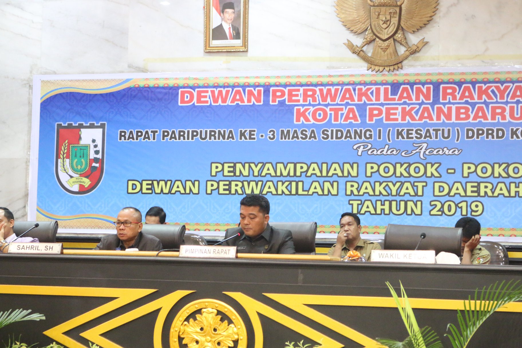 PEKANBARU - Melalui rapat paripurna ke 3 masa sidang I (Kesatu), Dewan Perwakilan Rakyat Daerah (DPRD) Kota Pekanbaru menyampaikan pokok-pokok pikiran yang dirangkum melalui berbagai agenda, mulai dari studi banding, rapat dengar pendapat atau hearing, hasil turun kelapangan atau reses hingga hasil musrenbang, Selasa (12/2/2019).