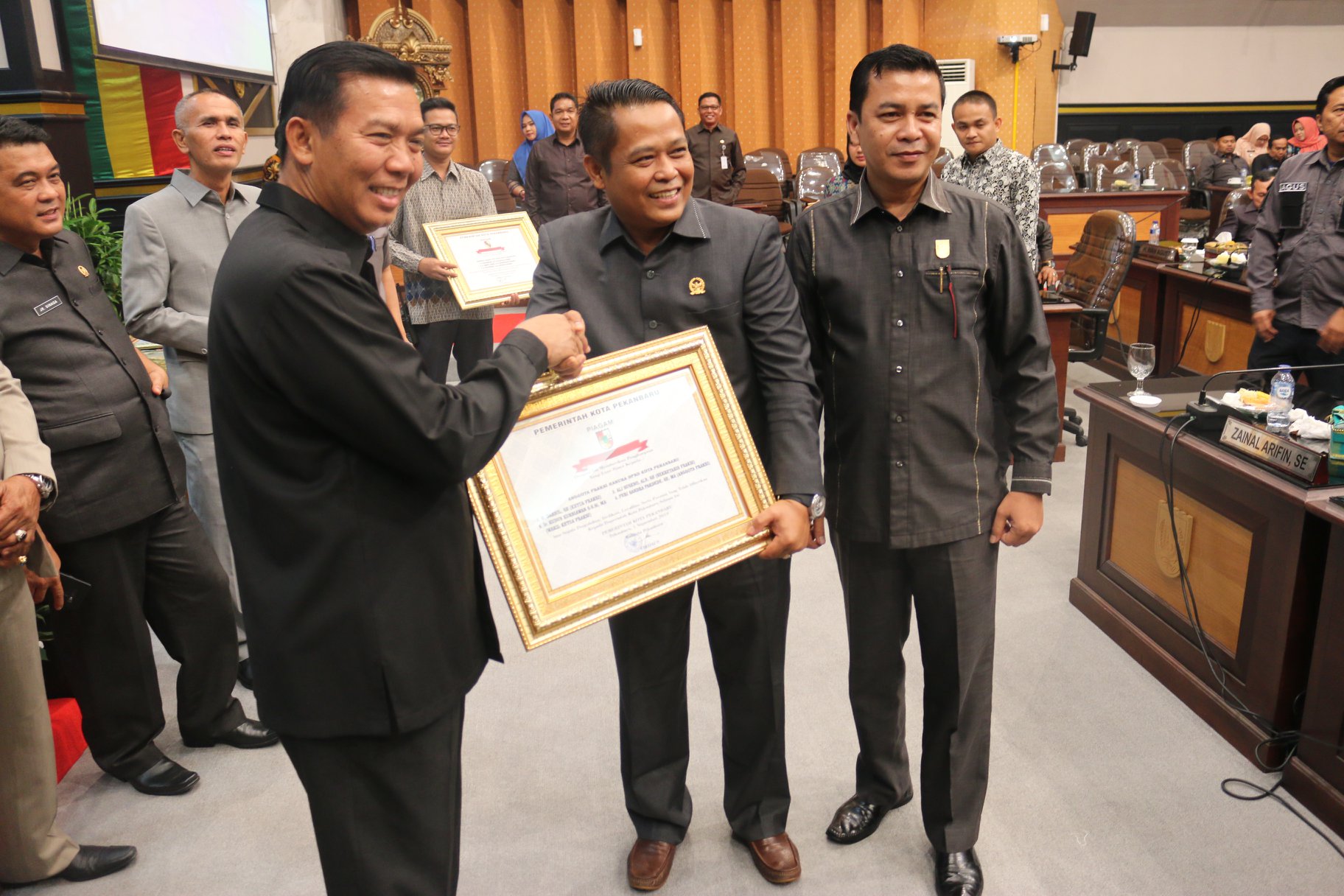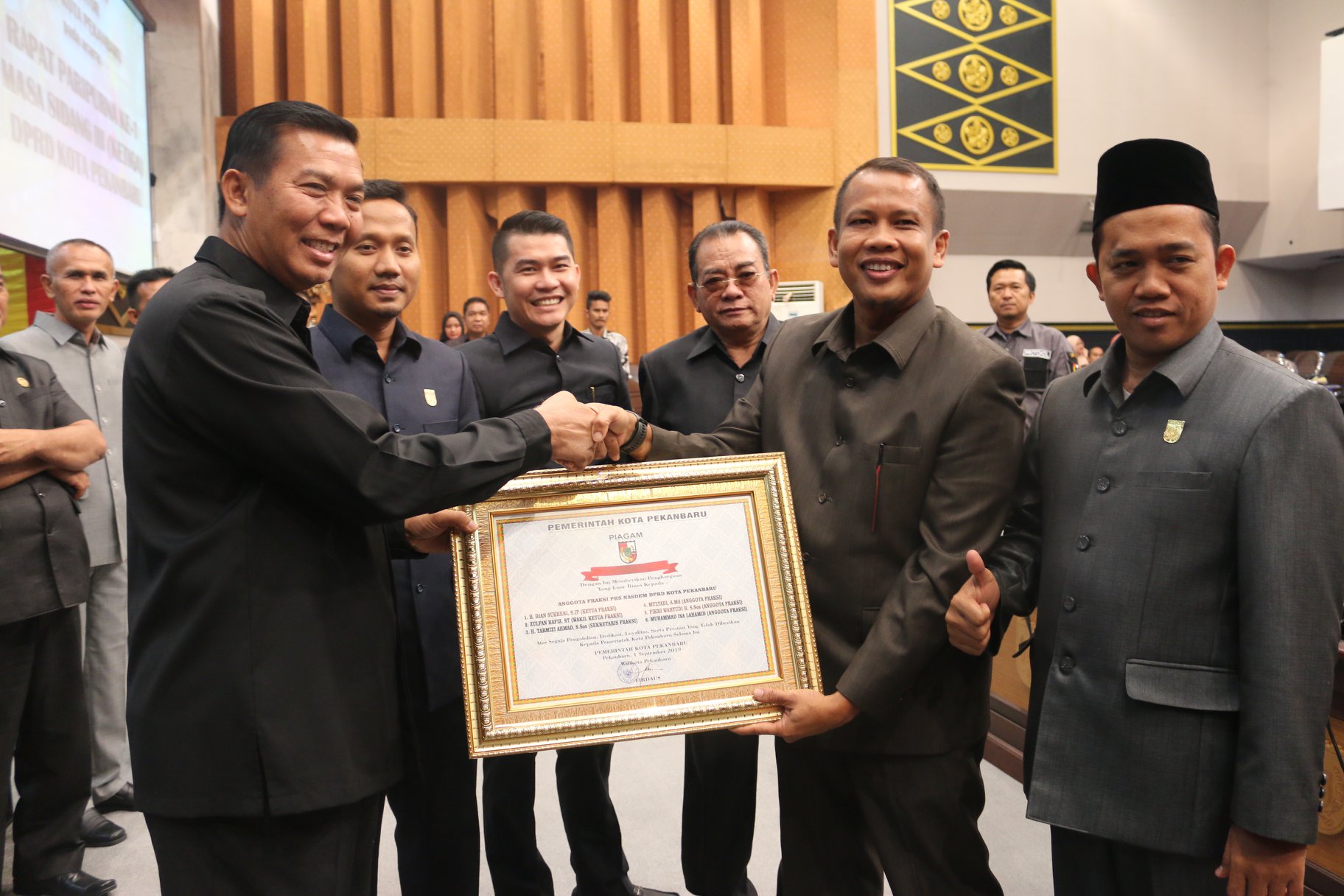 Walikota Pekanbaru Firdaus menyerahkan penghargaan kepada Anggota DPRD Pekanbaru periode 2014-2019