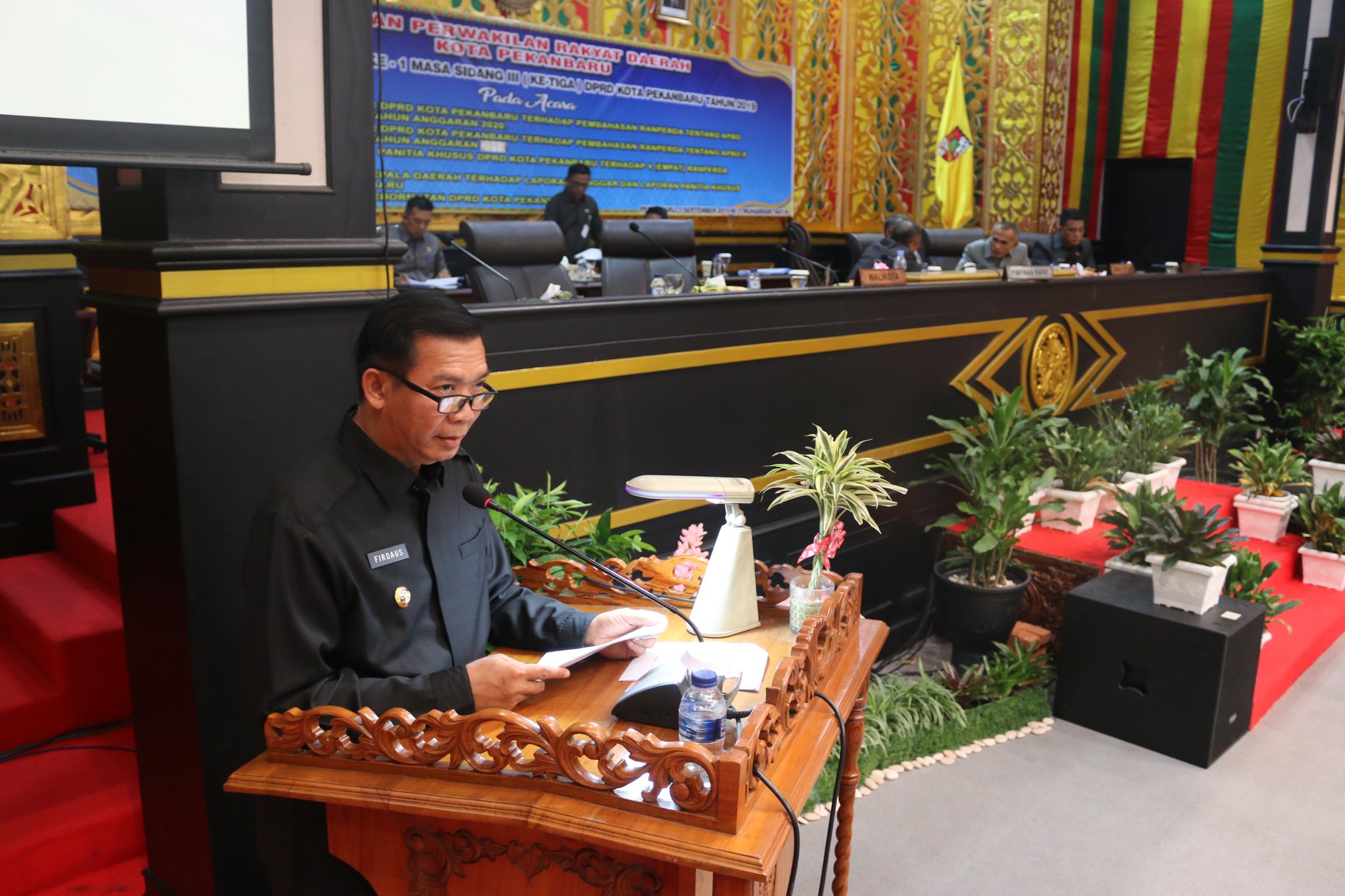 Walikota Pekanbaru Firdaus menyampaikan laporan pada paripurna pengesahan 4 Ranperda menjadi Perda